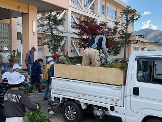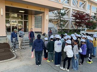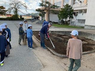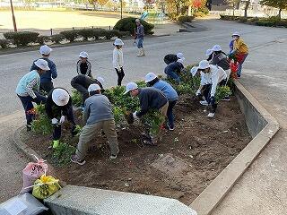 4年生が畑お助け隊(森本義彦さん、平中公貴さん、井上雄志さん、岩原信男さん)のお力をお借りして、花壇をきれいにしました。普段、畑お助け隊の皆様は、休日に作業してくださいますが、この日は4年生児童と一緒に作業をしました。4年生は、地域の方の支えと自分たちの普段の手入れがあって、花がきれいに咲いていることを知ることができました。